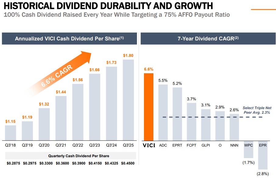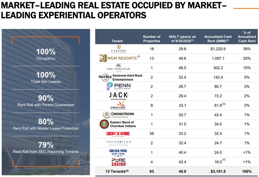 But importantly, none of these issues reflect cracks in VICI’s fundamentals. Rent coverage remains strong, occupancy is effectively 100%, and lease escalators continue to push cash flows higher.