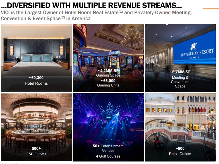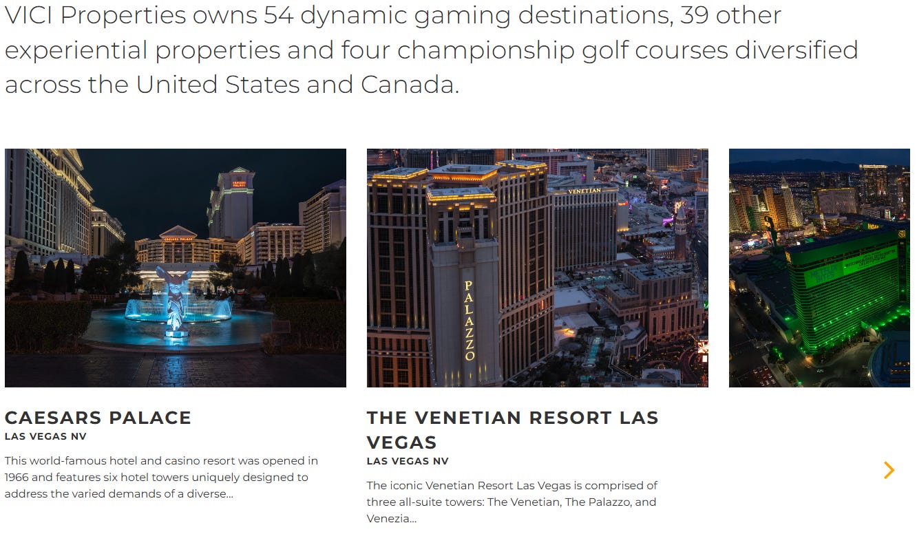 Instead of focusing on traditional commercial properties like offices or apartments, VICI owns iconic entertainment and hospitality assets - primarily full-scale casino resorts on the Las Vegas Strip and across the country. These are high-traffic, high-cash-flow properties that are extremely difficult to replicate, giving VICI a durable competitive moat.