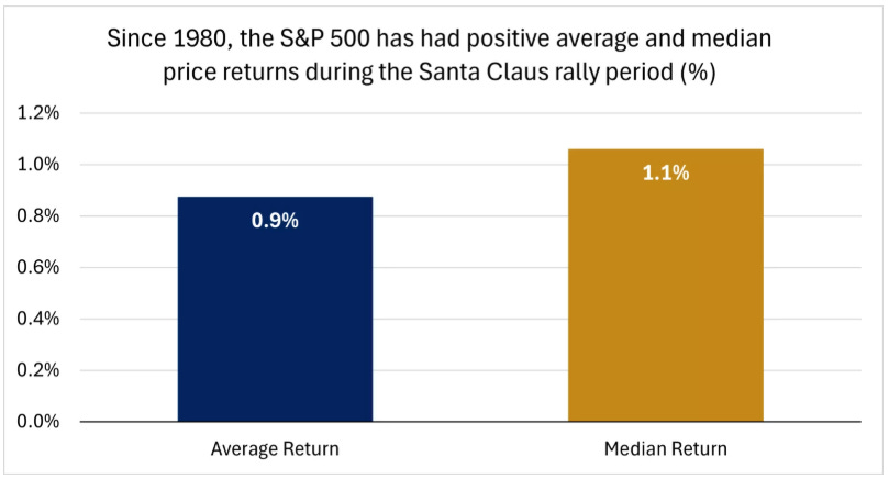 The final December catalyst is the one investors love to talk about: the Santa Claus rally. Historically, the last five trading days of the year plus the first two of January have been a sweet spot for markets. Since 1980, this period has delivered gains 73% of the time, with the S&P 500 averaging a 1.1% bump.