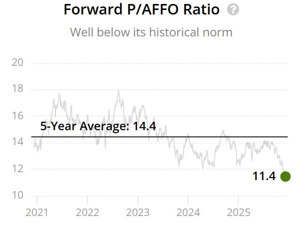 The forward P/AFFO sits below the historical - 11.4x v 14.4x.