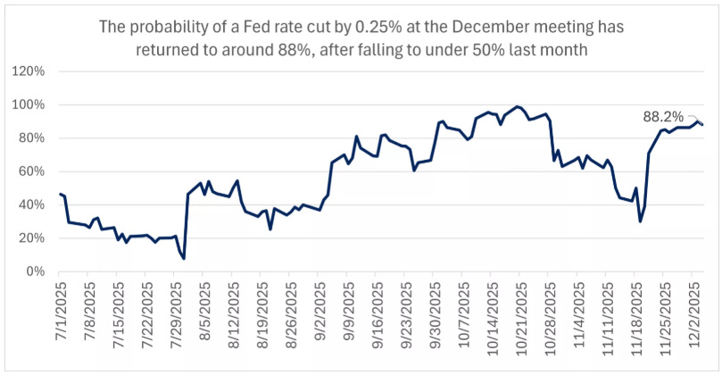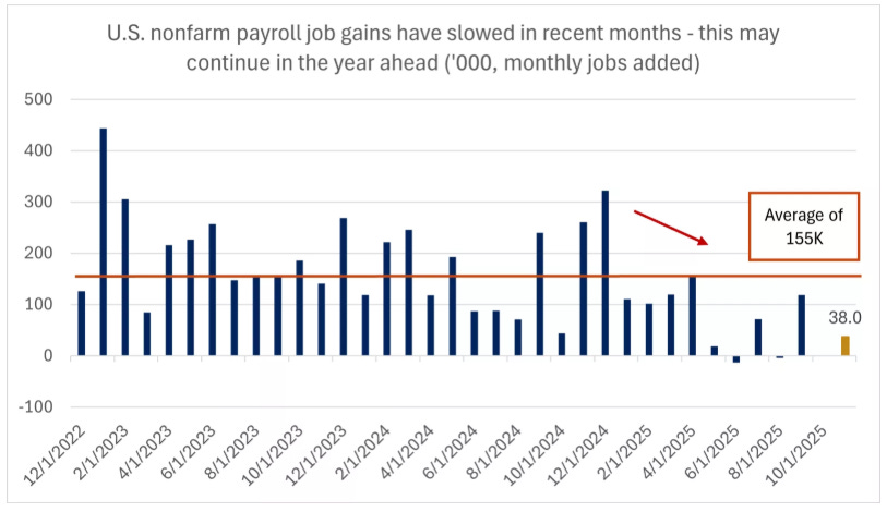 Near-term growth may look softer - partly due to the October government shutdown and mixed labor-market signals - but it is expected that the broader economy will grow at trend next year. The Fed likely won’t want to risk a shaky labor patch turning into something more serious.
