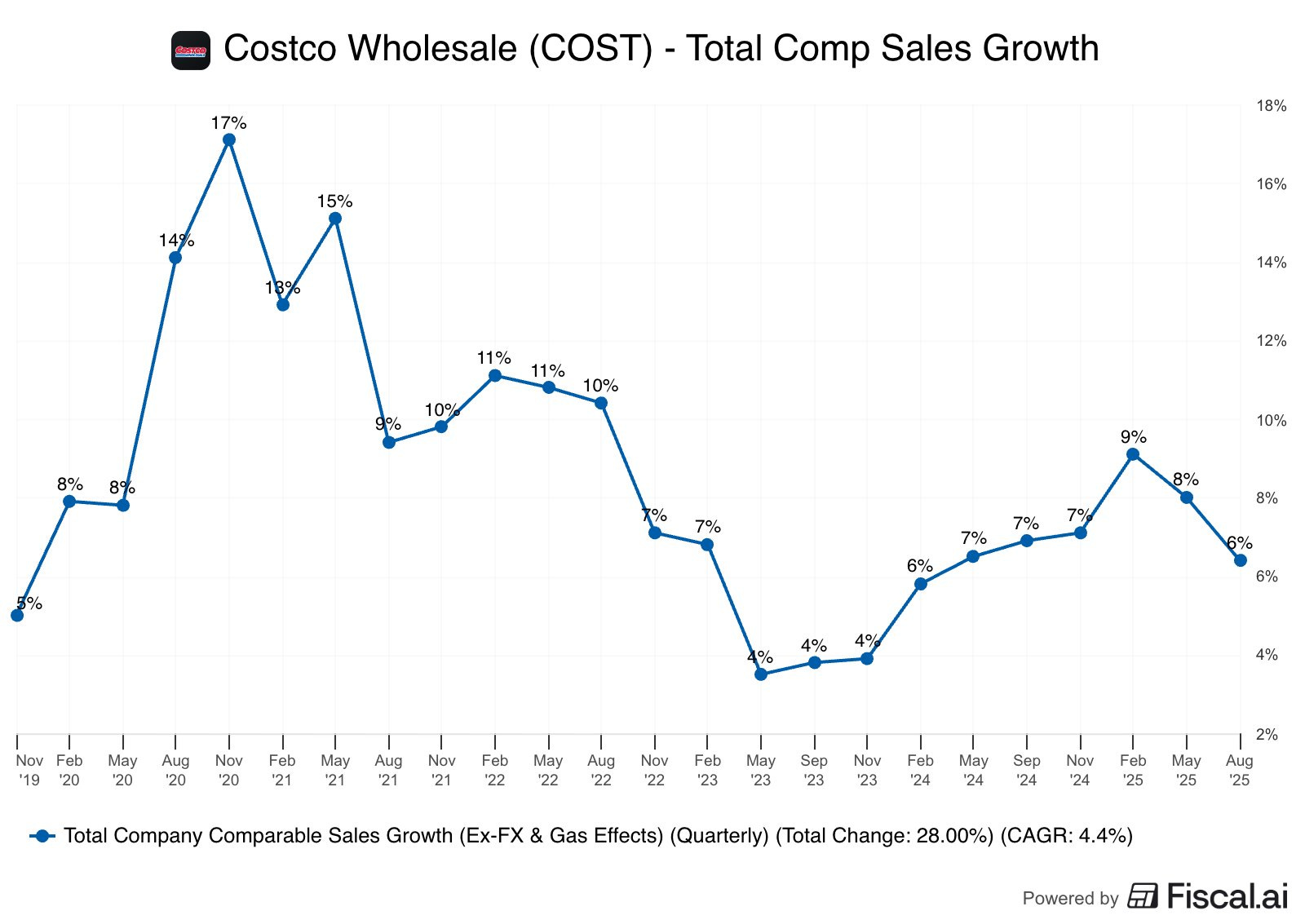 Costco’s Q4 FY25 results were solid but not spectacular. Comparable sales rose about 5.7% (or 6.4% excluding gas prices and currency effects), with U.S. comps hitting roughly 6%, showing that domestic momentum remains strong.