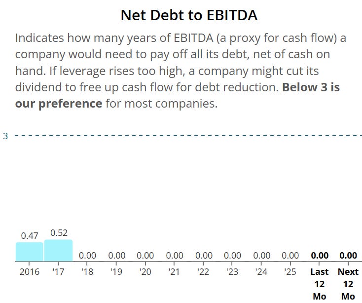 Net debt to EBITDA is 0 meaning it won’t take Costco even one day to pay off all of their debt - strong balance sheet.