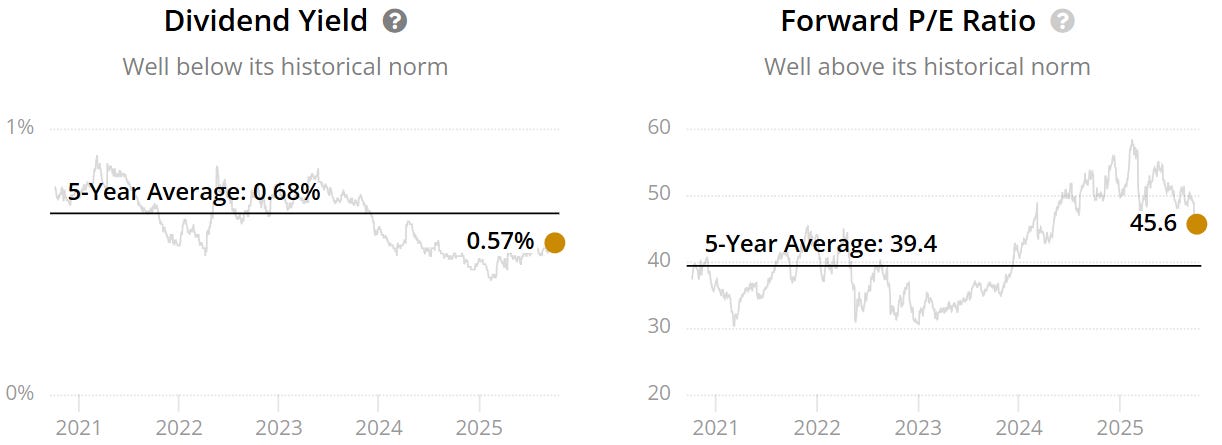 The forward P/E still even after the poor performance sits above the historical - 45.6x v 39.4x. This could indicate the company is overvalued.
