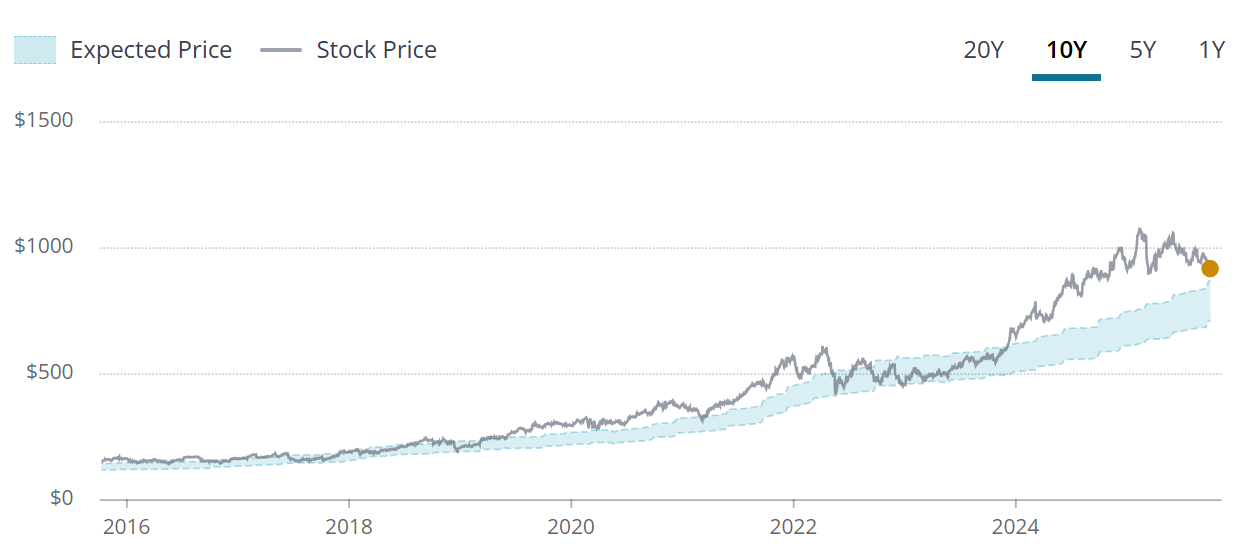 The blue tunnel methodology highlights that the company typically trades at a premium as it is above even the upper end and this seems to be a consistent trend looking back over 10Y.