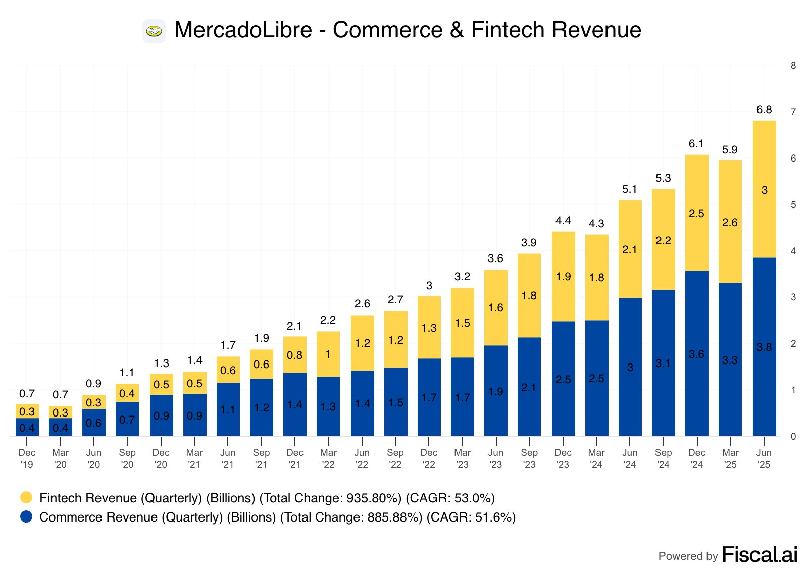 Across both commerce and fintech, MercadoLibre has delivered 50%+ compound annual growth over the last five years, highlighting the strength of its dual-engine strategy.