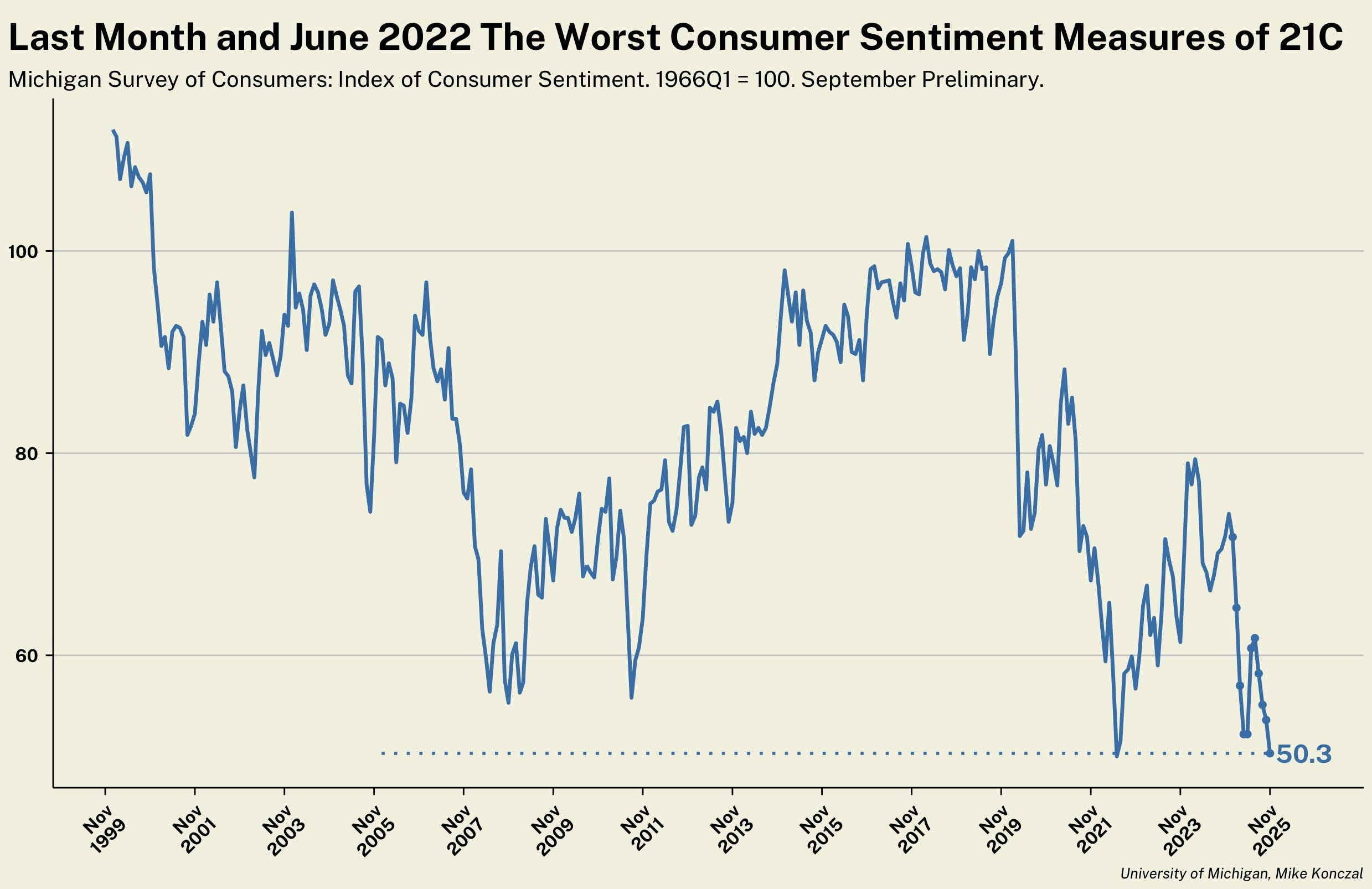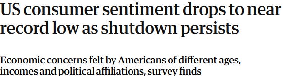 Consumers aren’t feeling great. The University of Michigan’s sentiment index dropped to 50.3 - the weakest since 2022. People are more worried about their personal finances and short-term business conditions, and inflation expectations ticked slightly higher to 4.7%. The government shutdown likely didn’t help confidence either.