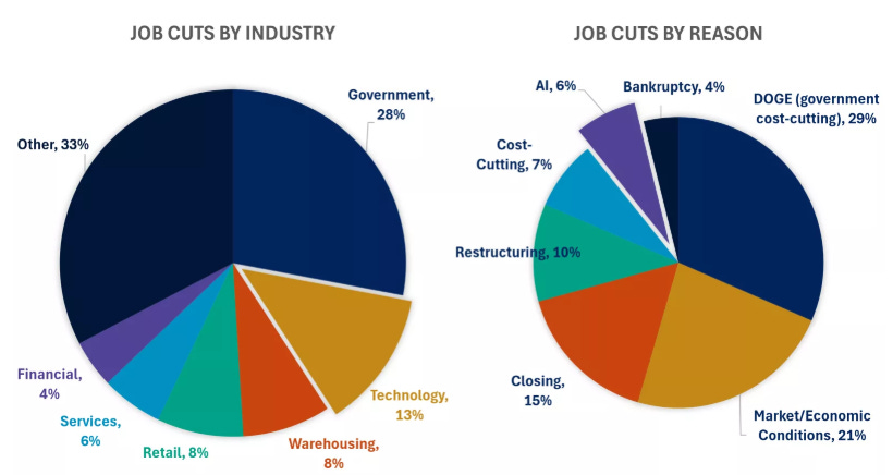 Adding to the unease, layoff announcements jumped again. Challenger, Gray & Christmas reported that October job cuts nearly tripled from a year ago, and interestingly, AI was cited as the second most common reason for those layoffs - behind general cost-cutting. So far this year, about 6% of all announced job cuts have been linked to AI. It’s not the main driver yet, but it’s beginning to register.