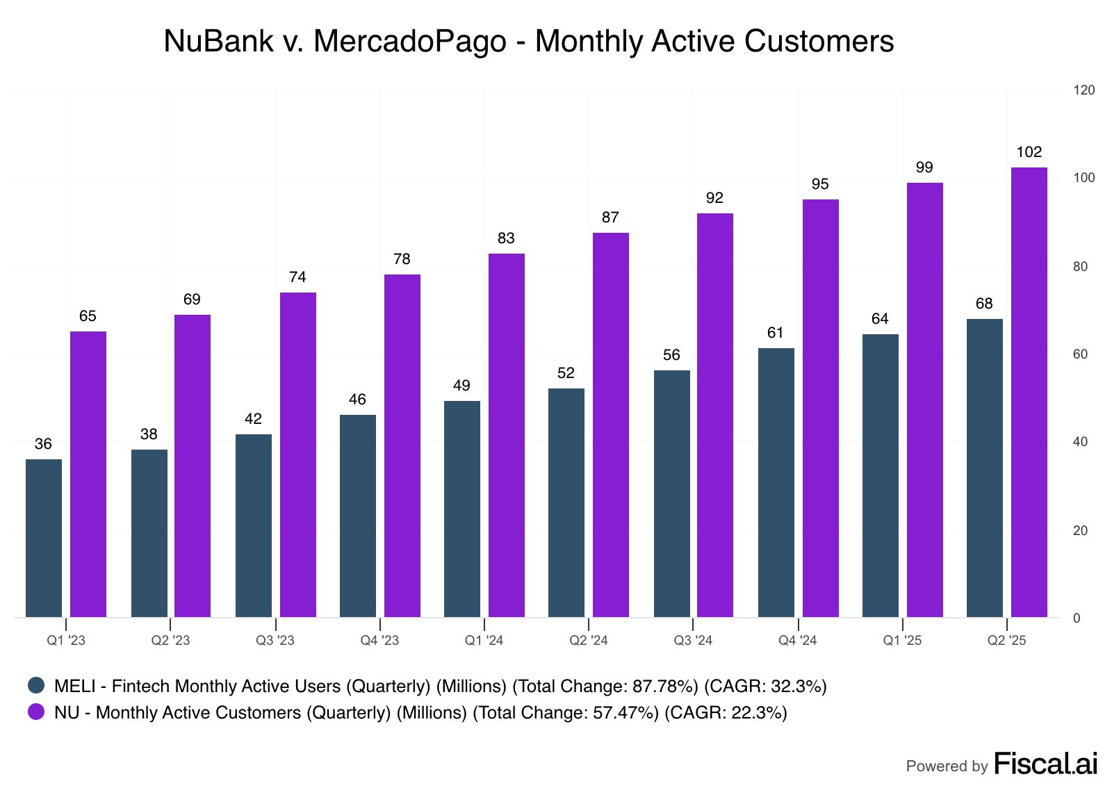 The fintech segment, MercadoPago, is also outpacing many peers. It now boasts 68 million monthly active users, growing 30% year-over-year, compared with NuBank’s 102 million users growing 17% YoY.