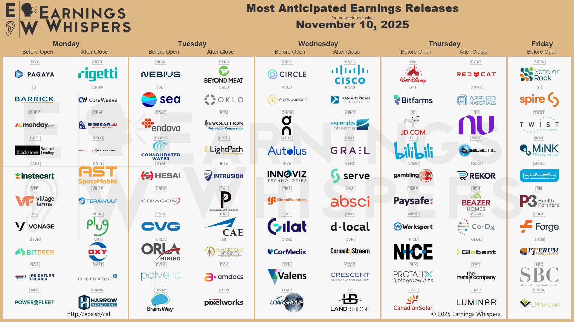 The most anticipated earnings releases for the week of November 10, 2025, are Rigettie Computing #RGTI, CoreWeave #CRWV, Nebius #NBIS, BigBear.ai #BBAI, Beyond Meat #BYND, Oklo #OKLO, Rocket Lab #RKLB, Circle Internet #CRCL, Arcos Dorados #ARCO, and AST SpaceMobile #ASTS.