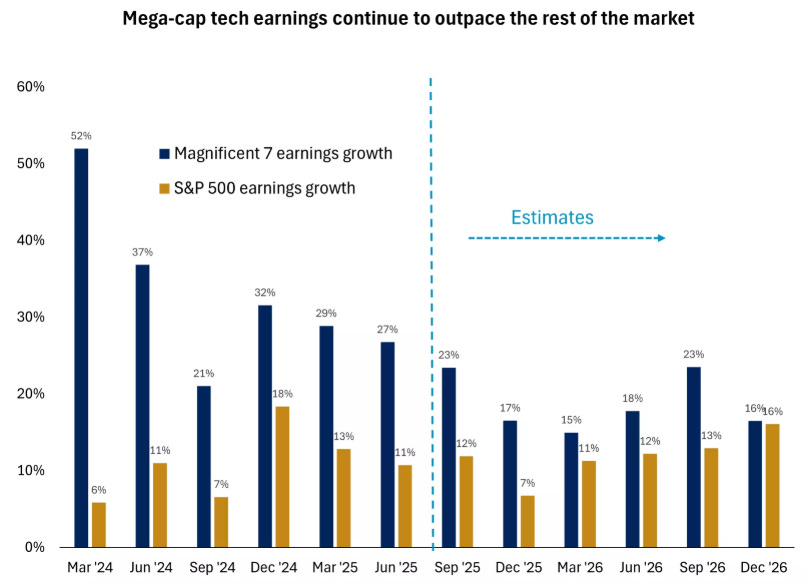 Tech continues to lead the charge. The sector delivered 22% earnings growth, with the “Magnificent Seven” - Amazon, Apple, Meta, Alphabet, and Microsoft - once again outpacing the broader market. Many of these firms even raised profit guidance and AI-related spending, signaling confidence that demand is still growing fast.