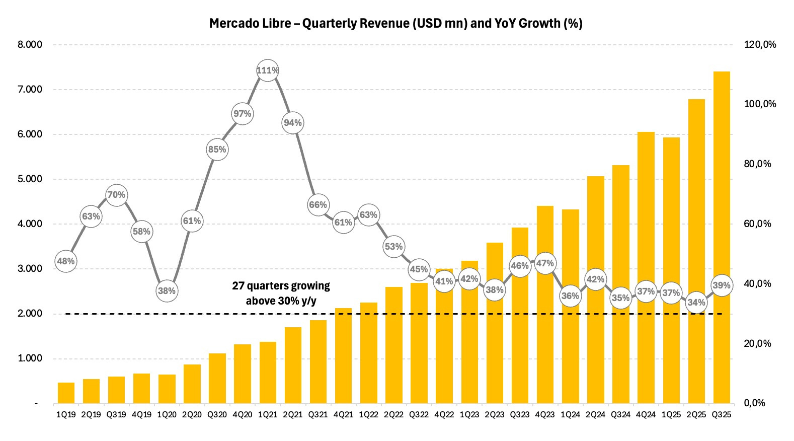MercadoLibre has now posted 27 consecutive quarters of year-over-year revenue growth above 30%, making it the only public company in the world - out of over 83,000 - to sustain this kind of performance.