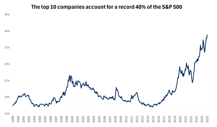 Ever since ChatGPT burst onto the scene in late 2022, the “Magnificent Seven” have gone parabolic - up nearly 190%, helping lift the S&P 500 by around 75%. That surge has created something we haven’t seen before: extreme market concentration. The top ten stocks now make up over 40% of the entire S&P 500.