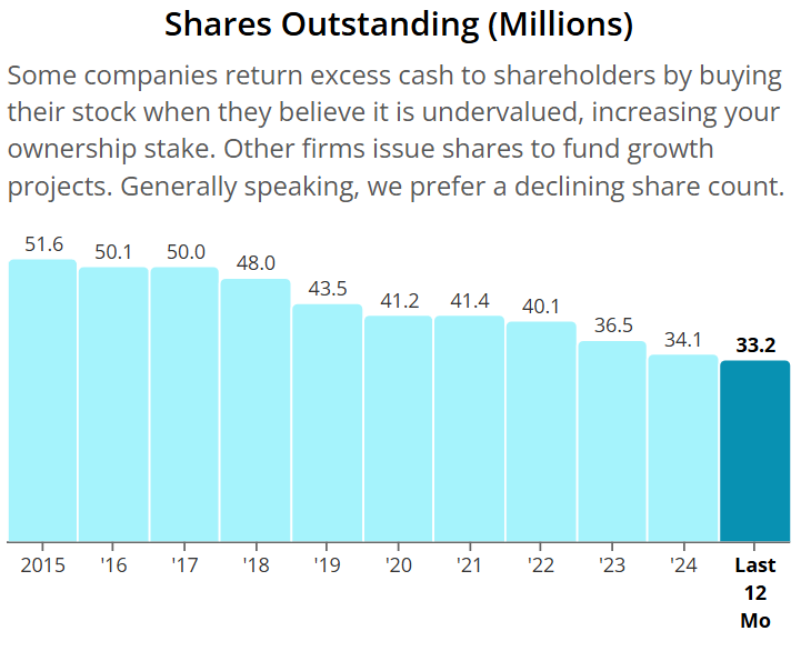 Operationally, the business is leaner than ever. Shares outstanding have fallen from 51.6 million to just 33.2 million over the past 10 years — a huge win for long-term holders.
