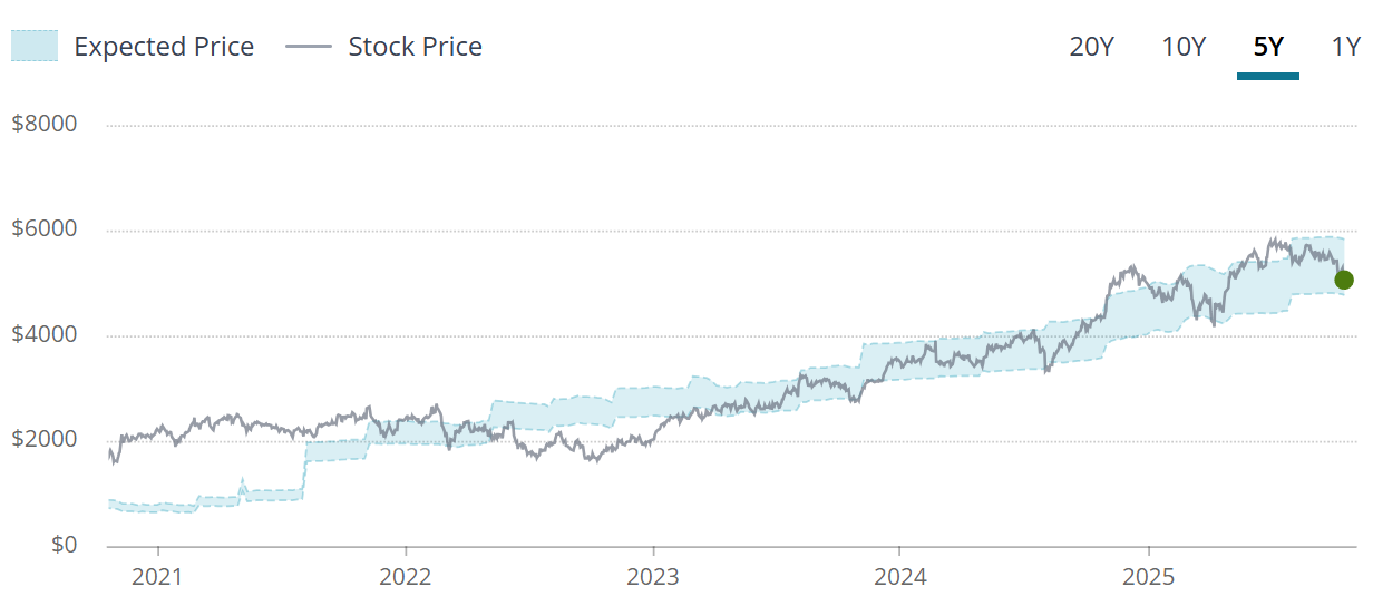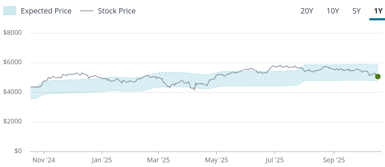 The blue tunnel methodology highlights that the company is at the bottom end of the intrinsic/fair value boundaries indicating a reasonable/slight undervaluation.