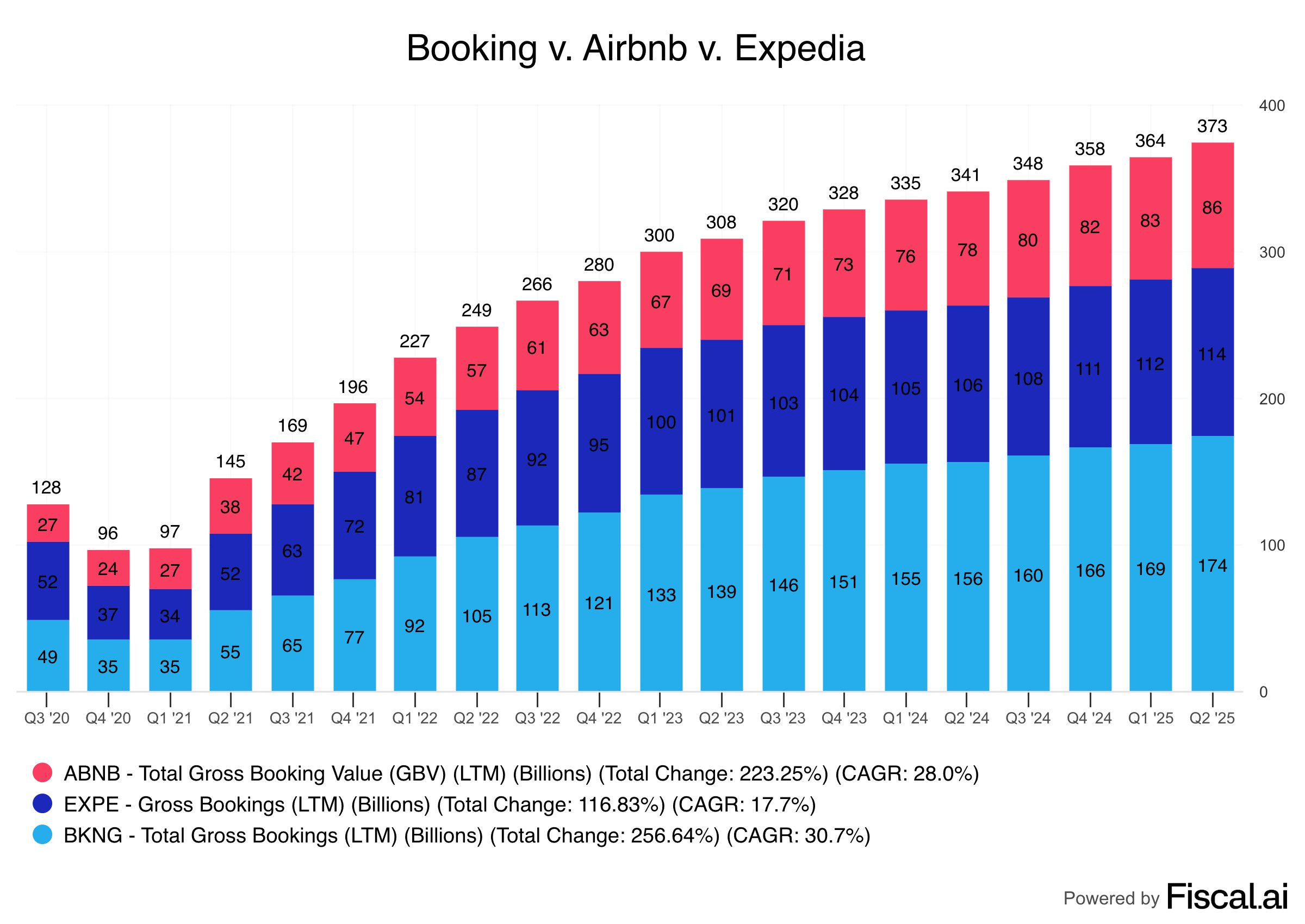 and when you compare overall top-line growth, Booking has outpaced Airbnb and Expedia with a 31% CAGR — remarkable for a company of its size.