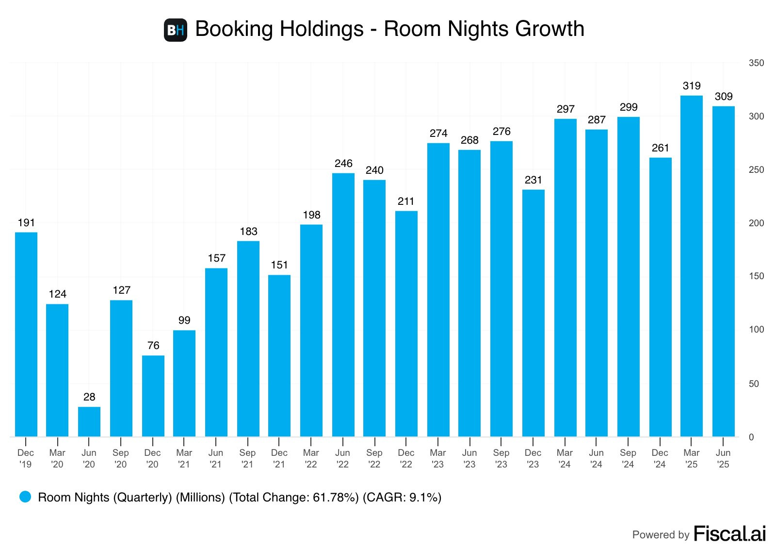 Growth-wise, the momentum hasn’t slowed either. Room nights booked have compounded at roughly 9% per year over the past five years,