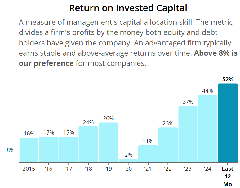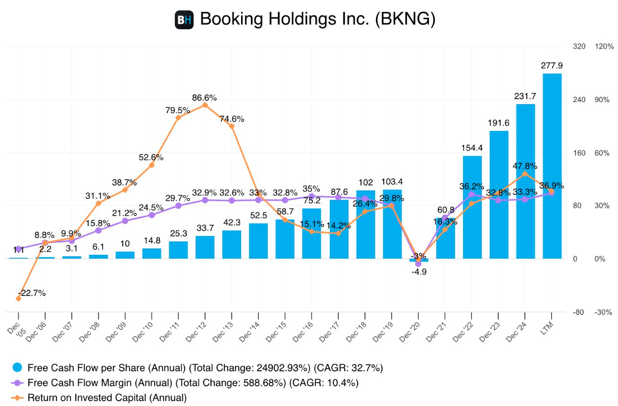 Over the last decade, Booking has grown free cash flow per share by 33% annually, and seen free cash flow margin grow with a 10% CAGR, and has a stellar 52% return on invested capital (ROIC) — numbers few companies in any industry can match.