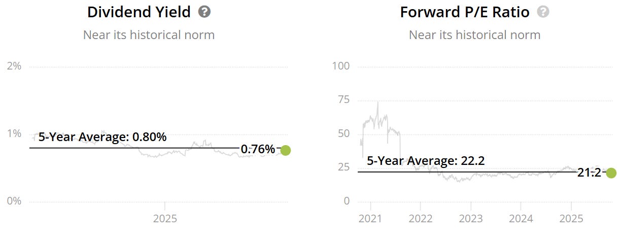 The forward P/E sits below the historical - 21.2x v 22.2x. This could indicate the company is potentially undervalued.