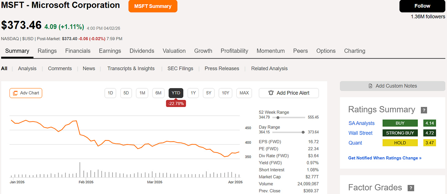 In other words, the market is no longer pricing Microsoft like an untouchable compounder. It is pricing it much closer to a mature platform - and that is where the opportunity starts to improve.