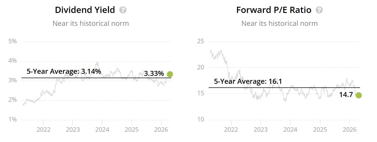 The forward P/E and dividend yield also sit close to their historical norms, which makes this look less like a market overreaction and more like a stock trading in a range that is broadly understandable. There may be upside from here, and the Wall Street target suggests as much, but the valuation discount was not wide enough for me to put it in the top tier.