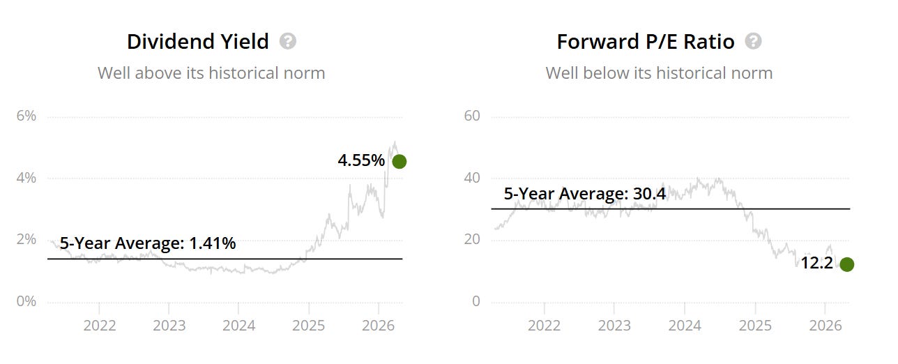 Its forward P/E has compressed to about 12x, far below its five-year average of roughly 30x. Its dividend yield has jumped to around 4.6%, which is also well above normal.