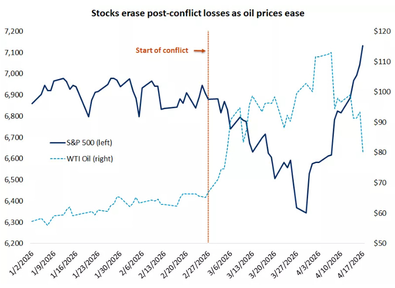 The S&P 500 has ripped back toward record highs. Oil has cooled off. Bond yields have steadied. And sentiment has recovered quickly enough that fear is already starting to give way to something closer to optimism again.