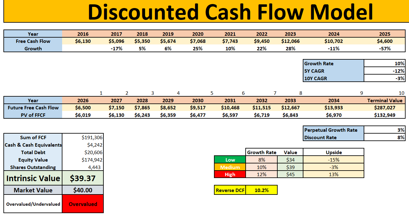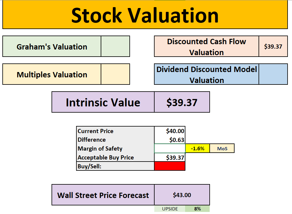 My intrinsic value came out at roughly $39.37, versus a market price around $40, leaving a negative margin of safety of about 1.6%. Even the implied upside to the Wall Street target was only around 8%.