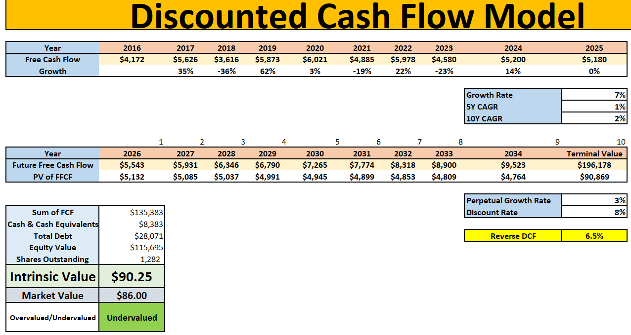 If anything, the stock looked roughly fairly valued to modestly undervalued, with my DCF pointing to value in the high $80s to low $90s against a share price around $86.